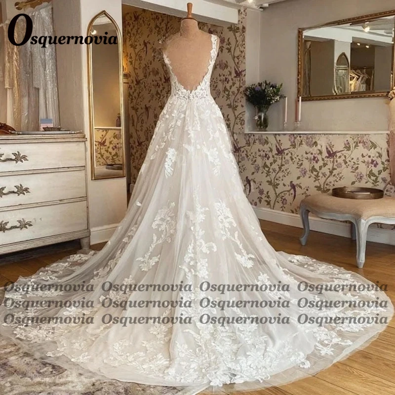 Osquernovia Atttrative Backless Bridal Dress for Women Lace Appliques Pleat V-neck Vestido De Casamento Customised Plus Size